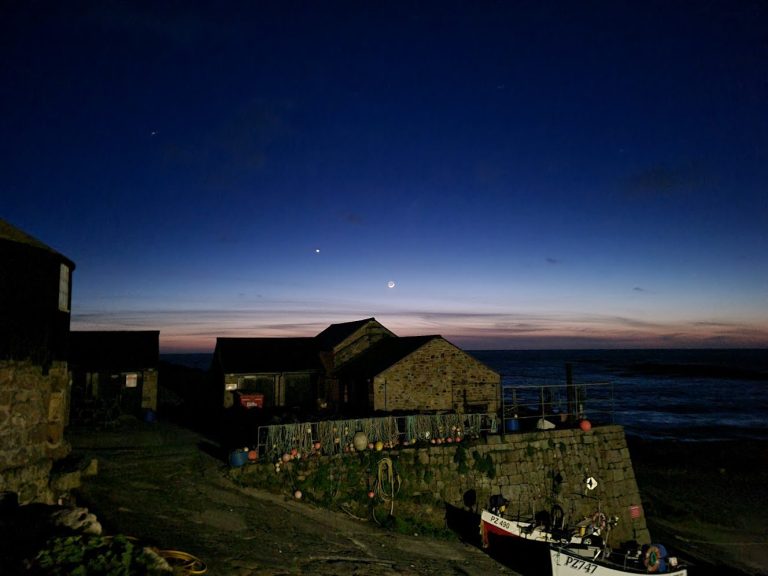 I decided to have a beer and quite forgot all about it. I walked the girls around after tea into a very pleasant early evening in The Cove. There was still enough power in the sea to send a few waves over the Harbour wall, but it was a big lacklustre, even I could see that. Later still, on our last walk of the evening, we were met with the perfect picture of Venus and a waxing crescent moon hanging over the Harbour in a midnight blue sky. And it was not even midnight. What a delight.