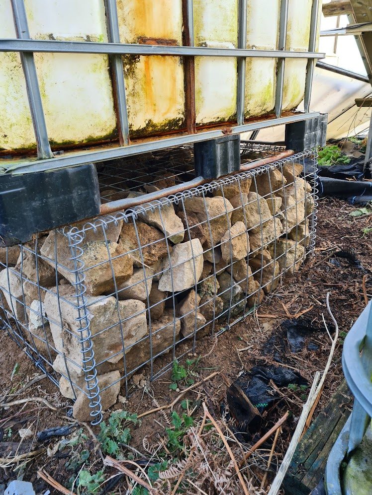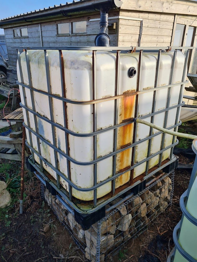 One IBC sitting on a lovingly filled gabion cage.