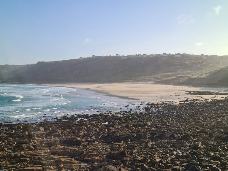 We awoke this morning to the bay a maelstrom of white water and a complex of random large, white-capped waves hurtling in towards the beach and flattening into a foamy blanket fifty yards out. Along the cliffs waves churned and leapt in white ragged columns all the way from Cape to Aire Point. All the while the sea egged on by a fierce northwesterly that had peaked during the night at 55 miles per hour at Land’s End and had refused to give up. We will avoid mention of Gwennap Head, windiest place in the universe, where it topped 65 miles per hour. Oh, just mentioned it.